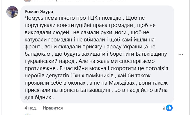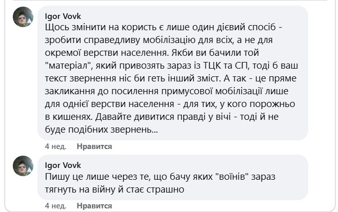 Кроме того, авторы обращения настаивают: стоит внимательно относиться к людям, которые могли быть вовлечены в такие акции на фоне тяжелого эмоционального состояния из-за потери родных. А также подчеркивают, что и правоохранители должны прилагать усилия, чтобы виновные в атаках на центры комплектования были установлены и получили справедливое наказание. Плюс подписанты считают необходимым разрешить военнослужащим ВСУ или другим подразделениям Сил обороны открывать огонь, когда "при исполнении" на них совершаются нападения.