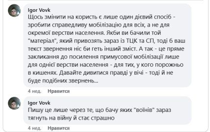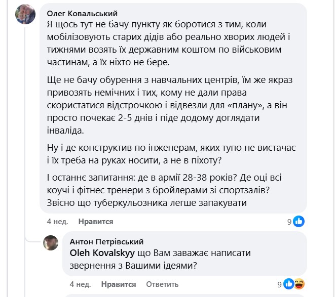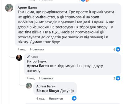 Среди военнослужащих напротив высказываются мнения, что ответственность за акции и призывы против мобилизации, препятствование проведению соответствующих мероприятий, а также нападения на центры комплектования необходимо усилить. Об этом говорится в обращении группы действующих военных и ветеранов, которое они направили в органы власти. Подписанты, в частности, считают, что следует "на законодательном уровне приравнять действия организаторов антимобилизационных мероприятий (и призывающих к таким действиям) к государственным изменникам, которые должны получать реальные лишения свободы". А также повысить штрафы, а в отдельных случаях предусмотреть лишение свободы для участников таких "демаршей", которые подключаются к блокированию автотранспорта ТЦК или зданий, где находятся мобилизованные. Плюс ужесточить наказание для нападающих на представителей центров комплектования.