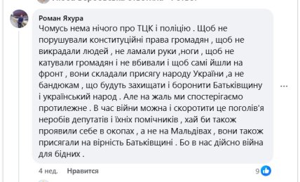 Обращение вызвало неоднозначную реакцию. Много одобрительных отзывов и слов поддержки, в первую очередь от военных, которые приводят собственные примеры срыва мобилизации и подрыва доверия к ВСУ. Среди комментаторов звучат мысли и о том, что если бы не случаи силовой "бусификации" не было бы "кривых взглядов гражданских граждан в сторону военных".