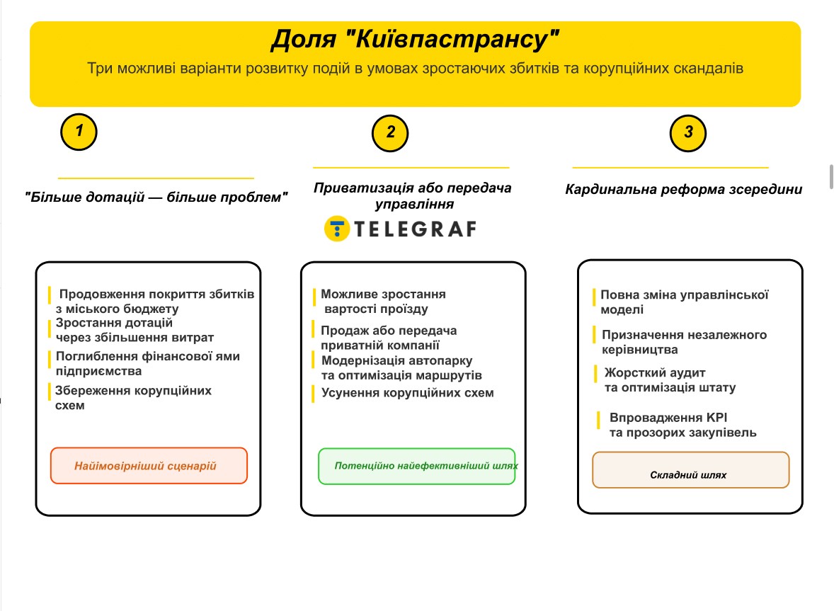 Учитывая рост убытков, коррупционные скандалы и низкую эффективность, перед "Киевпасстрансом" предстает несколько возможных путей. Ни один из них не сулит легких решений, но каждый может кардинально изменить ситуацию.