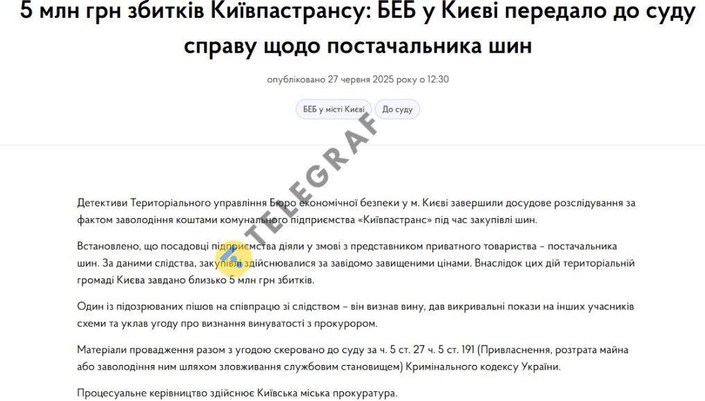 В 2025 году Бюро экономической безопасности передало в суд дело о растрате 5 миллионов гривен при закупке шин по завышенным ценам. Прокуратура сообщила о подозрении директору компании-поставщика электроэнергии, продававшей "Киевпасстрансу" электричество с переплатой более 11 миллионов гривен.