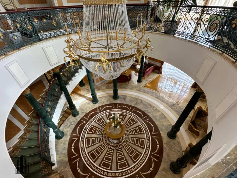 Продавец указывает, что дом построен из "премиальных материалов, привезенных из разных уголков мира". В украшении использованы мрамор, оникс, золото, ценные породы дерева и камня. Работы выполняли топовые мастера.