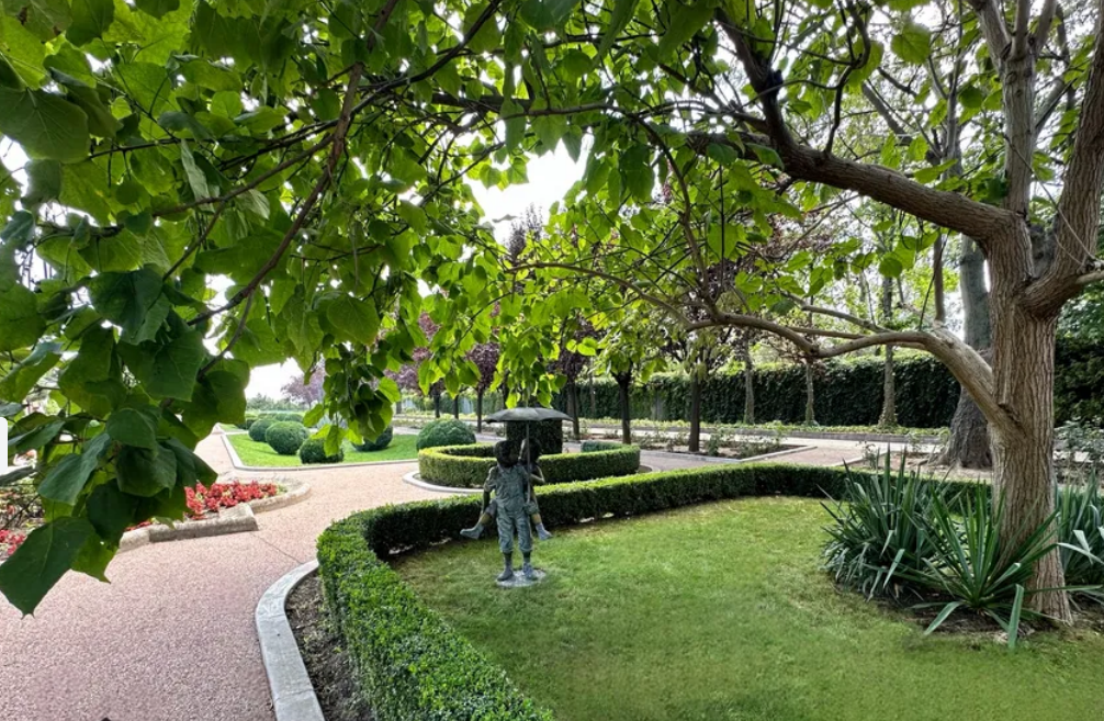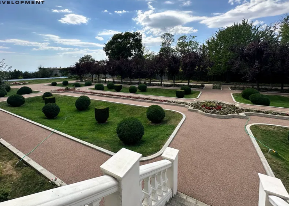 Постройки стоят посреди парка с многолетними растениями и интересными ландшафтными решениями. На территории есть водопад и пруд.