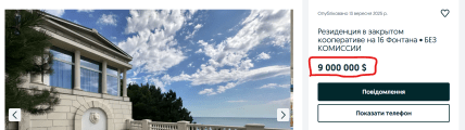Объявление о продаже поместья размещено на одной из платформ продаж. Он расположен на первой линии от моря, площадь участка — два гектара, а площадь зданий — 2000 метров. Стоимость элитной недвижимости — 9 миллионов долларов (более 372 миллионов гривен).