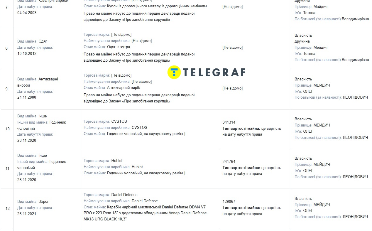 Сам нардеп тоже любит себя побаловать дорогими часами. У него их целая коллекция — самые дешевые, согласно данным декларации, стоят 241 тысячу гривен от бренда Hublot. Также Мейдич владеет часами CVSTOS (341 тысяча гривен) и Ulysse Nardin (неизвестно), однако к сожалению, модели не указаны.