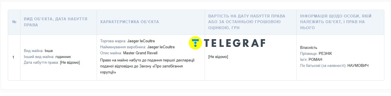 Депутат Черниговского горсовета из фракции "Рідний дім" Роман Резник, судя по всему любит не количество, но качество. В его декларации мы нашли всего одни часы, но зато какие — роскошные Jaeger leCoultre моделі Master Grand Reveil. Сейчас такие продаются примерно за два с половиной миллиона гривен.
