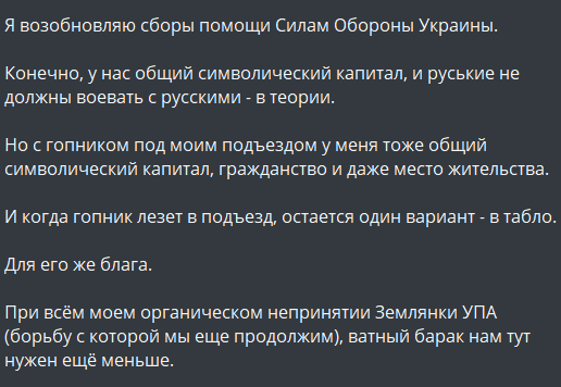Конечно, у нас (ред. — с россиянами) есть общий символический капитал… Но с гопником под моим подъездом у меня тоже есть общий символический капитал, гражданство и даже место жительства. И когда гопник лезет в подъезд, остается только один вариант – в табло