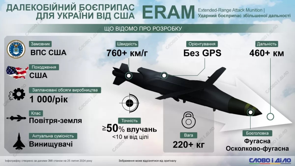 Extended Range Attack Munition (ERAM) – это фактически бомба-ракета воздушного базирования. Ближайшим аналогом ERAM можно считать российский "Гром-Е1", которым россияне периодически пытаются бить по украинским городам. Однако в отличие от российского "аналоговнетного" оружия, американская бомба-ракета значительно более дальнобойная и точная. Известны примерные тактико-технические характеристики ERAM: