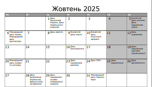 Всего в октябре 31 день, среди них — 23 рабочих. Праздничных дней 1, это День защитников и защитниц Украины (1 октября), но во время военного положения он считается обычным рабочим днем.