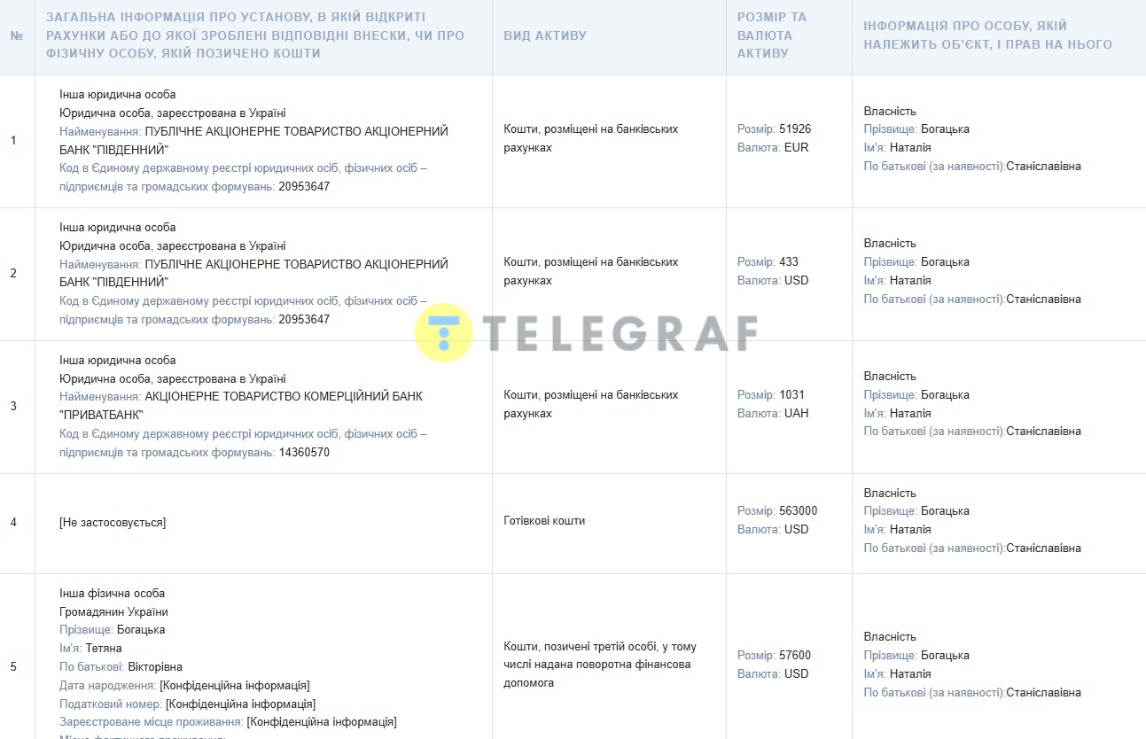 Однако самая любопытная часть декларации Богацкой — это сбережения. Согласно документам, на её счетах храниться 563 тысячи долларов и 52 тысячи долларов (в пересчете на гривны около 30 миллионов).