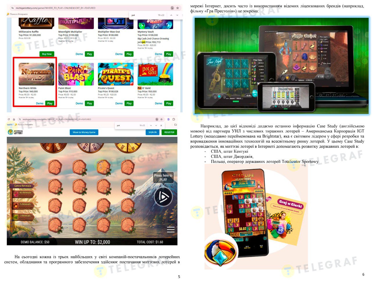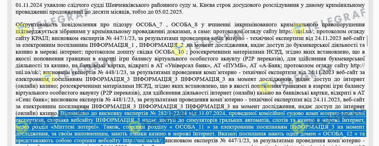 "Согласно заключению экспертов № 282/1-22/24 от 31.07.2024, проведенной комиссионной судебно компьютерно-технической экспертизы, страница вебсайта ИНФОРМАЦИЯ_3 предоставляет доступ к симуляторам игровых автоматов, слотов и казино в сети Интернет, через раздел "Мгновенные лотереи". Также, страницы раздела " ЛИЦО_11 " по электронной ссылке ИНФОРМАЦИЯ_3 на момент исследования, по своему наполнению, имеют признаки казино в сети Интернет. Указанные ссылки имеют один домен "ЛИЦО_12" и представляют собой страницы вебсайта http://unl.ua/ru/;", — говорится, в частности, в тексте судебного решения.