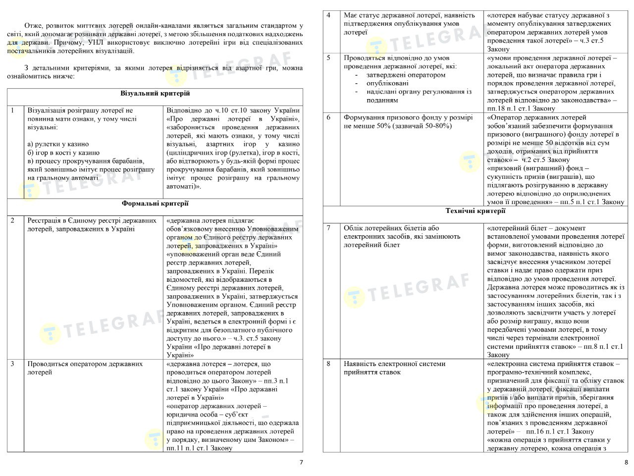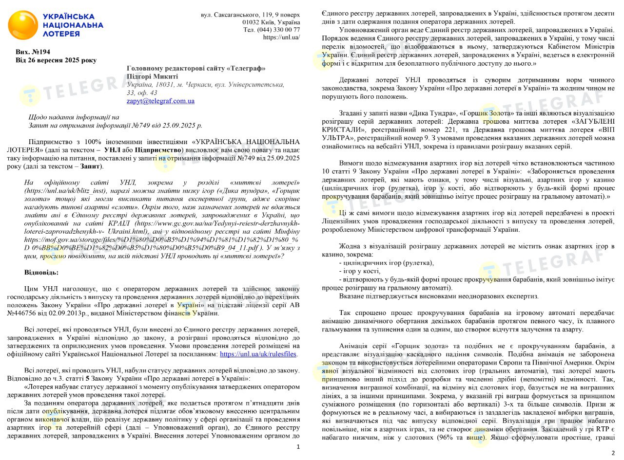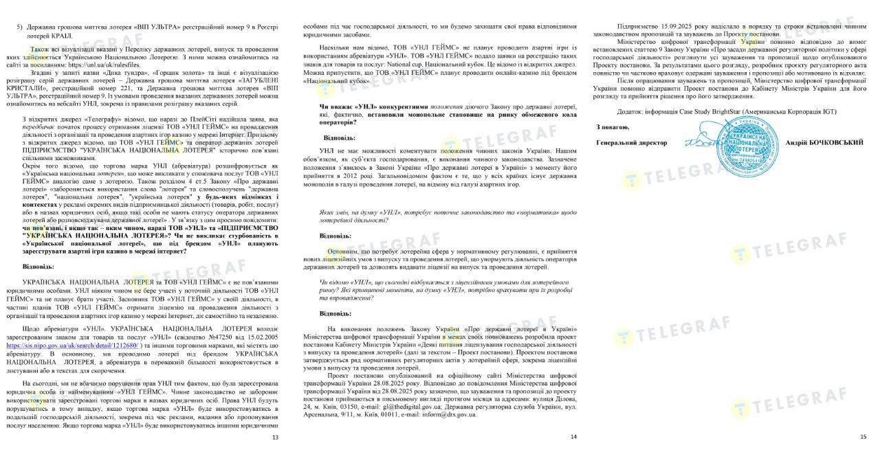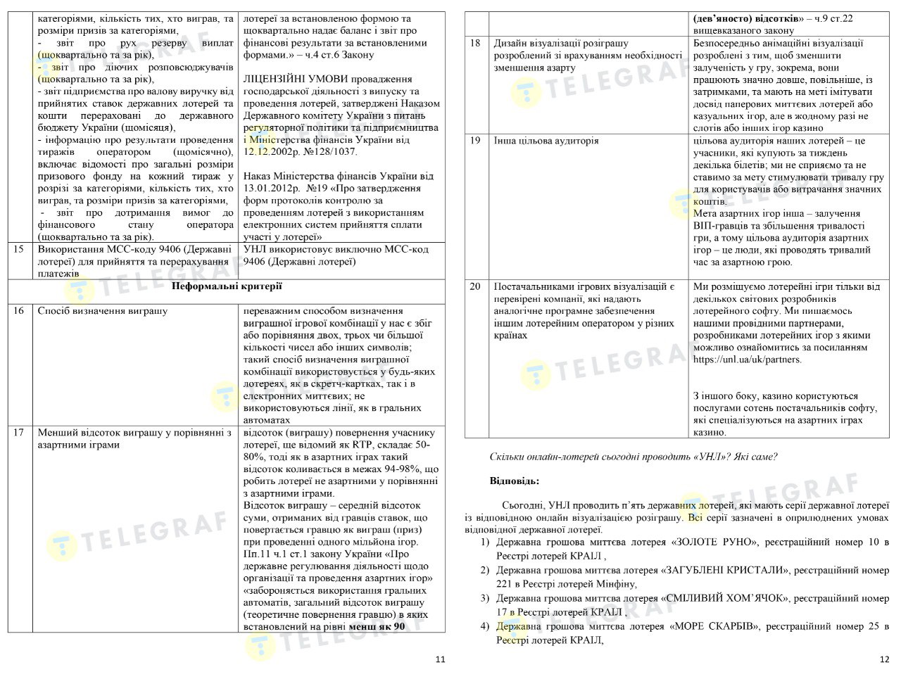 "Телеграф" направил запросы в адрес всех действующих операторов лотерей, а также в адрес ПлейСити, в которых мы просили прояснить их отношение к ряду моментов, которые вспоминаются в статье. Ко времени выхода текста поступил ответ только от компании УНЛ. Учитывая значительный объем ответа, редакция публикует его в виде скриншотов в соответствующем разделе, чтобы полностью сохранить позицию этого оператора гослотерей. Редакция также готова при поступлении ответов опубликовать позиции и других участников.