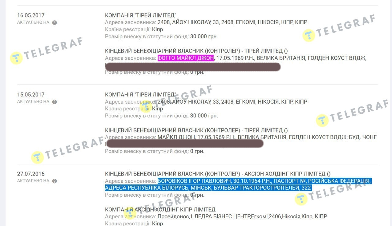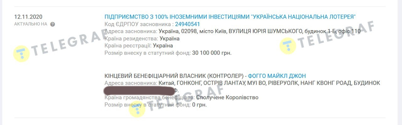 По данным аналитической системы YouControl, основателем Предприятия "Украинская Национальная Лотерея" сегодня является прописанное в Макао HONG KONG RUI BO INVESTMENT LIMITED. А единственным бенефициарным владельцем указан гражданин Великобритании Майкл Джон Фогго.
