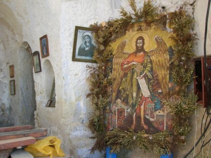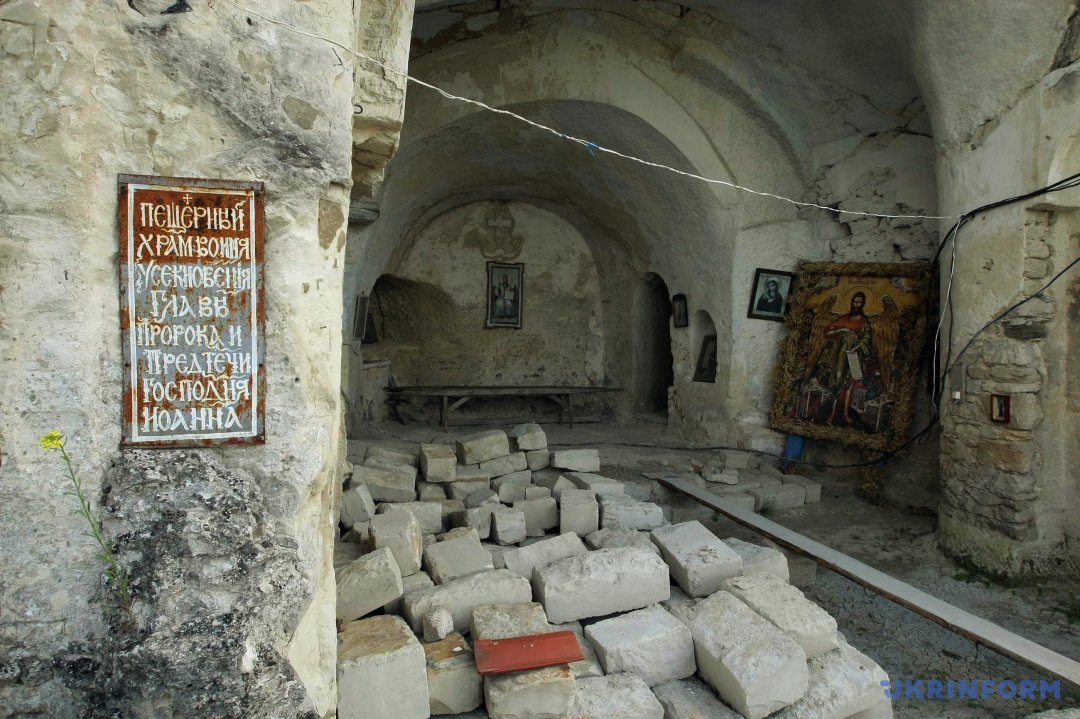 Первый пещерный храм обители посвятили Усекновению главы Иоанна Предтечи. Снаружи его украшает огромная неотесанная известняковая глыба, покрытая древними надписями и эмблемами, которые покидали паломники разных эпох. Эта уникальная "монастырская летопись в камне" хранит память о тысячах верующих, следовавших сюда на протяжении веков.