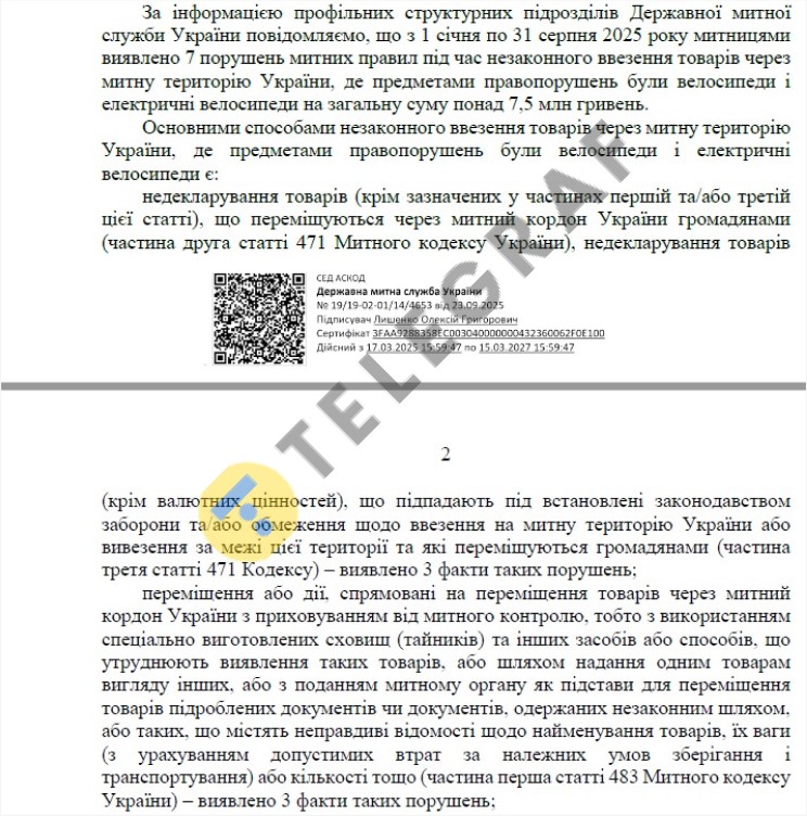 С 1 января по 31 августа 2025 г. таможни выявили 7 нарушений таможенных правил во время незаконного ввоза велосипедов и электрических велосипедов. Общая сумма конфискованного товара – более 7,5 миллиона гривен.