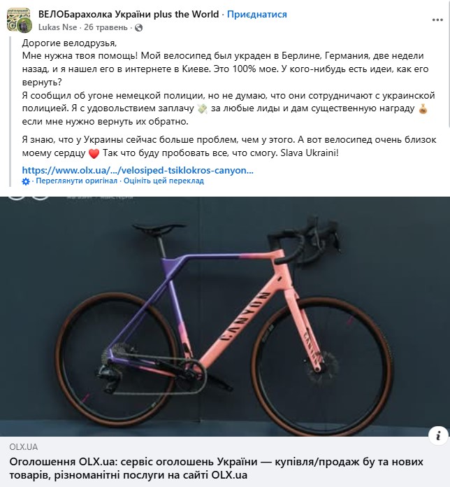 А в мае этого года немец, велосипед которого был угнан в Берлине, нашел его на ОЛХ. Причем продавцом был популярный магазин под названием Veloman. Мужчина обращался к неравнодушнным с просьбой помочь в возвращении велосипеда.