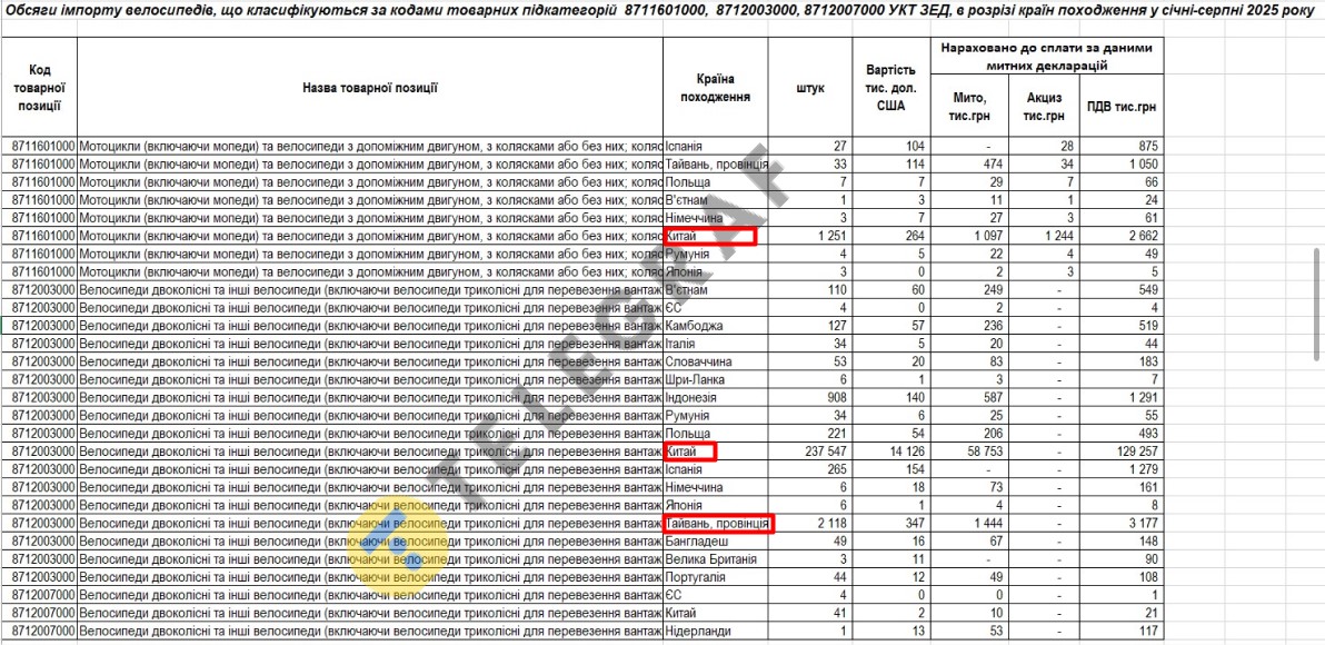 По данным таможни, больше налогов взимают с импорта из Китая. НДС – самая большая составляющая: для Китая это 129 257 тысяч гривен за обычные велосипеды. Акциз отсутствует для обычных велосипедов, но есть для электровелосипедов. Испания и некоторые европейские страны имеют льготы — для них действует нулевая пошлина.