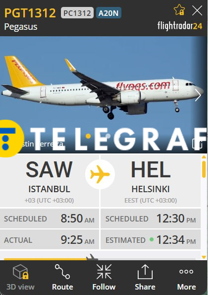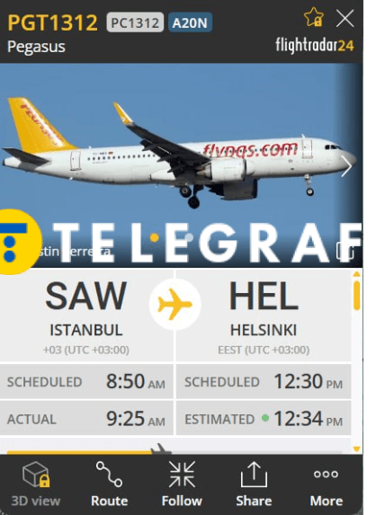 Еще один пассажирский самолет — А20N, который "засекли" радары в нашем небе, вылетел из Стамбула в 9:25 и сел в Хельсинки в 12:34. За это время воздушное судно, принадлежащее Pegasus Airlines, якобы "наведалось" в Украину, радары показали его пролет над Львовщиной.
