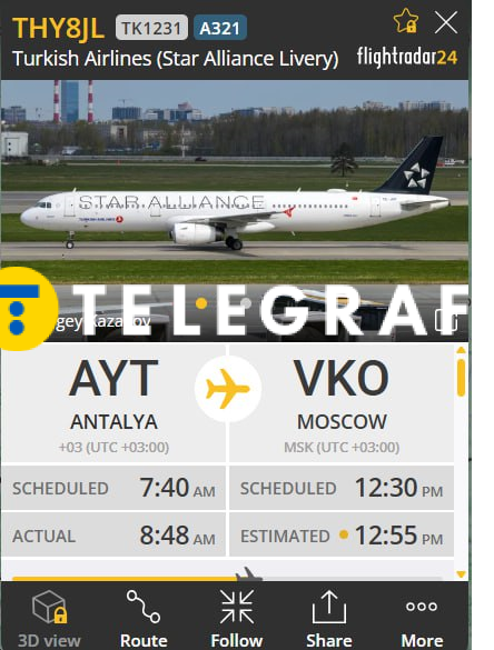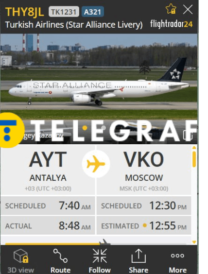 По данным радара, борт А321, авиакомпании Turkish Airlines, вылетел из турецкой Анталии с опозданием, в 8:48. Полет длился около двух с половиной часов и в течение этого времени самолет якобы пролетел над Львовщиной. Сел борт в Москве в 12:55.