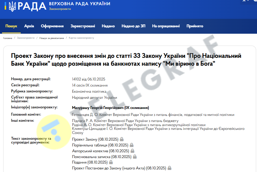6 октября 2025 года законопроект №14102 о внесении изменений в статью 33 Закона Украины "О Национальном Банке Украины" о размещении на банкнотах надписи "Ми віримо в Бога" подал народный депутат из фракции "Слуга народа" Георгий Мазурашу.