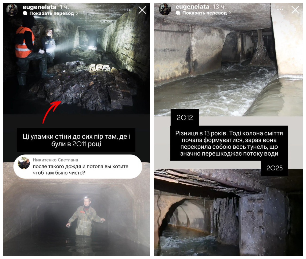 И тогда, и сейчас были в этом коллекторе участки частично разрушенные, частично забитые илом, отходами и из-за этого подтопленные. Сейчас видно, что уровень мусора за годы накапливался, накапливался и это привело к тому, что в некоторых местах он достигает потолка. То есть его количество такое, что оно не могло появиться моментально,