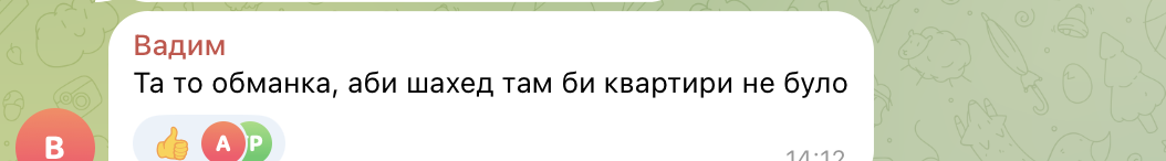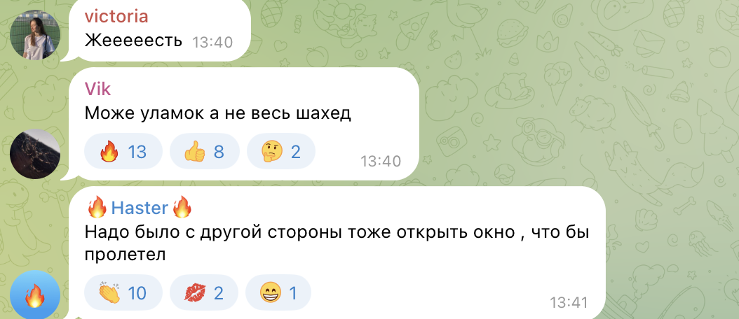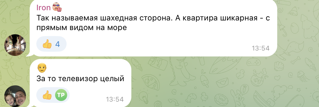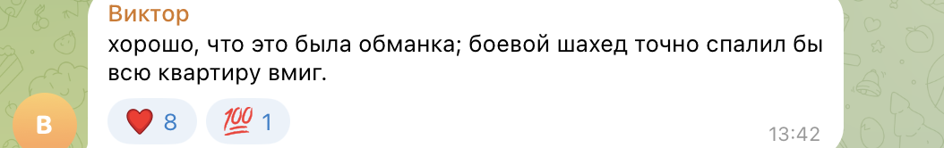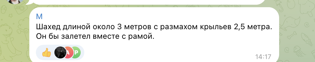 Такое же мнение пишут и пользователи в комментариях. По их словам, на видео не "шахед", а часть дрона Герань. Ведь если бы дрон действительно взорвался в квартире, разрушения были бы больше и возник пожар. Однако некоторые шутили об этой ситуации, написав, что надо было с противоположной стены открыть окно, чтобы дрон пролетел насквозь. Некоторые пользователи обратили внимание и на то, что телевизор в комнате уцелел.