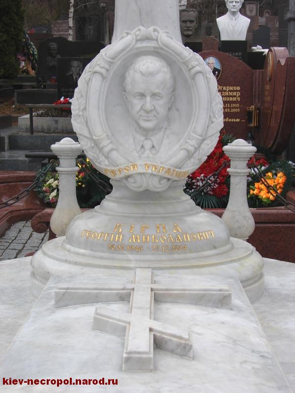 Похоронили министра на Байковом кладбище и установили ему большой мемориал. Над могилой Георгия Кирпы возвышается трехметровая белая колонна, на которой стоит бронзовый всадник. В руке всадник держит копье-крест, которым пронизывает змея. В самой колоне снизу изображен портрет Георгия Кирпы и написано "Герой Украины".