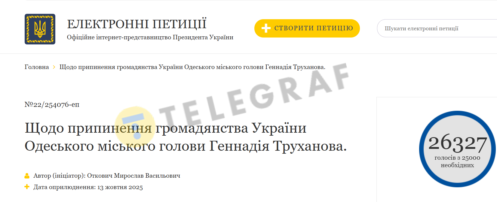 Петицию 13 октября зарегистрировал на сайте президента Мирослав Откович. По состоянию на 8 часов утра она набрала более 26 тысяч голосов. В тексте автор отметил, что его предложение лишить Труханова украинского гражданства основано на неоднократных появлениях журналистских расследований, содержащих данные о наличии у Геннадия Труханова паспорта гражданина российской федерации и российского налогового номера.
