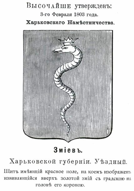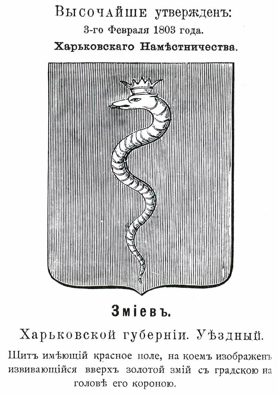 В XVIII веке первый герб Змиева изображал ползущего змея, однако официального утверждения он не получил. Лишь в 1803 г. император Александр I утвердил герб города с золотым змеем на красном фоне, что стало важным событием, подчеркивая статус города.
