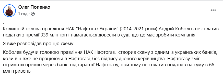 Коболев, уже не работая в "Нафтогазе", без подписи руководства смог получить премию через банк под гарантии компании, при этом не уплатив налогов на 66 млн гривен.