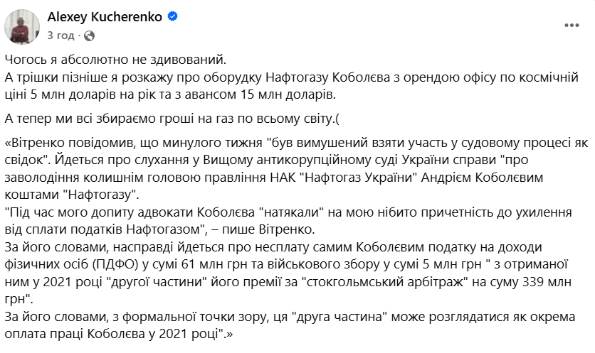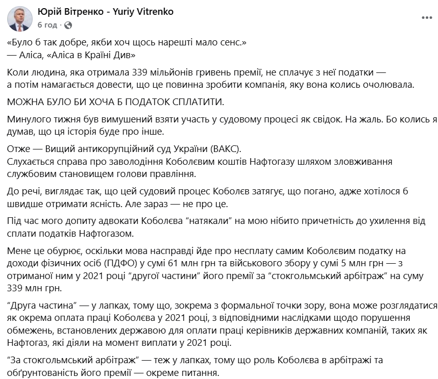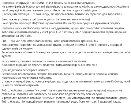 "Нафтогаз", как уверяет Витренко, присылал Коболеву письмо с напоминанием, что он должен самостоятельно уплатить налог, но тот не платил их в 2021 и 2022 годах.