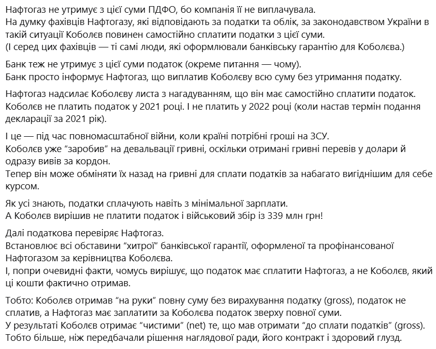 Он считает, что незаконно и несправедливо, чтобы компания уплачивала налог за Коболева. Тем более что сейчас "Нафтогазу" нужны деньги на закупку газа, а не на покрытие чужих налогов.