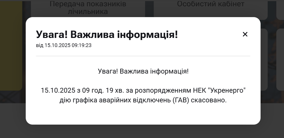 "Полтаваоблэнерго" сообщало, что по распоряжению НЭК "Укрэнерго", 15 октября в 7:34 была получена команда на применение трех очередей ГАО. Однако, к счастью, уже в 9:13 отключение отменили.
