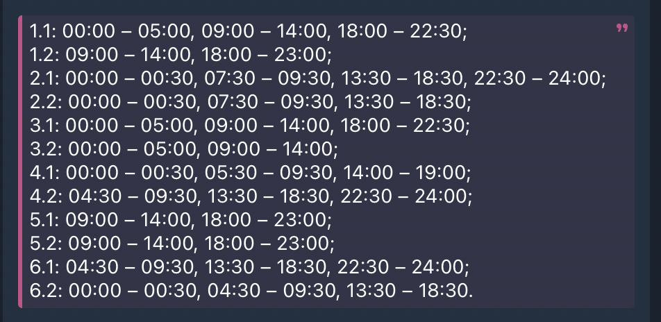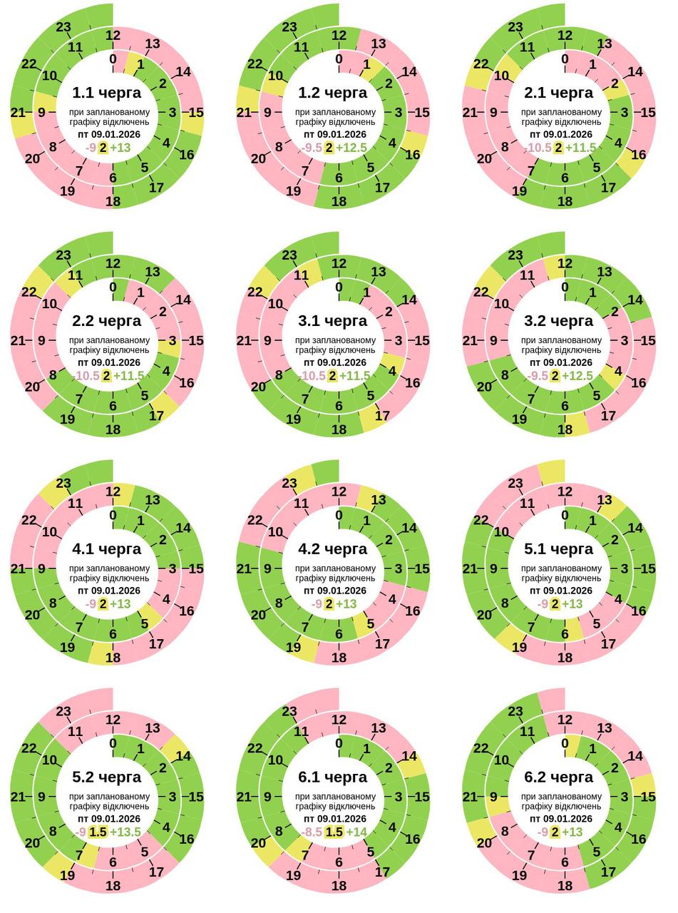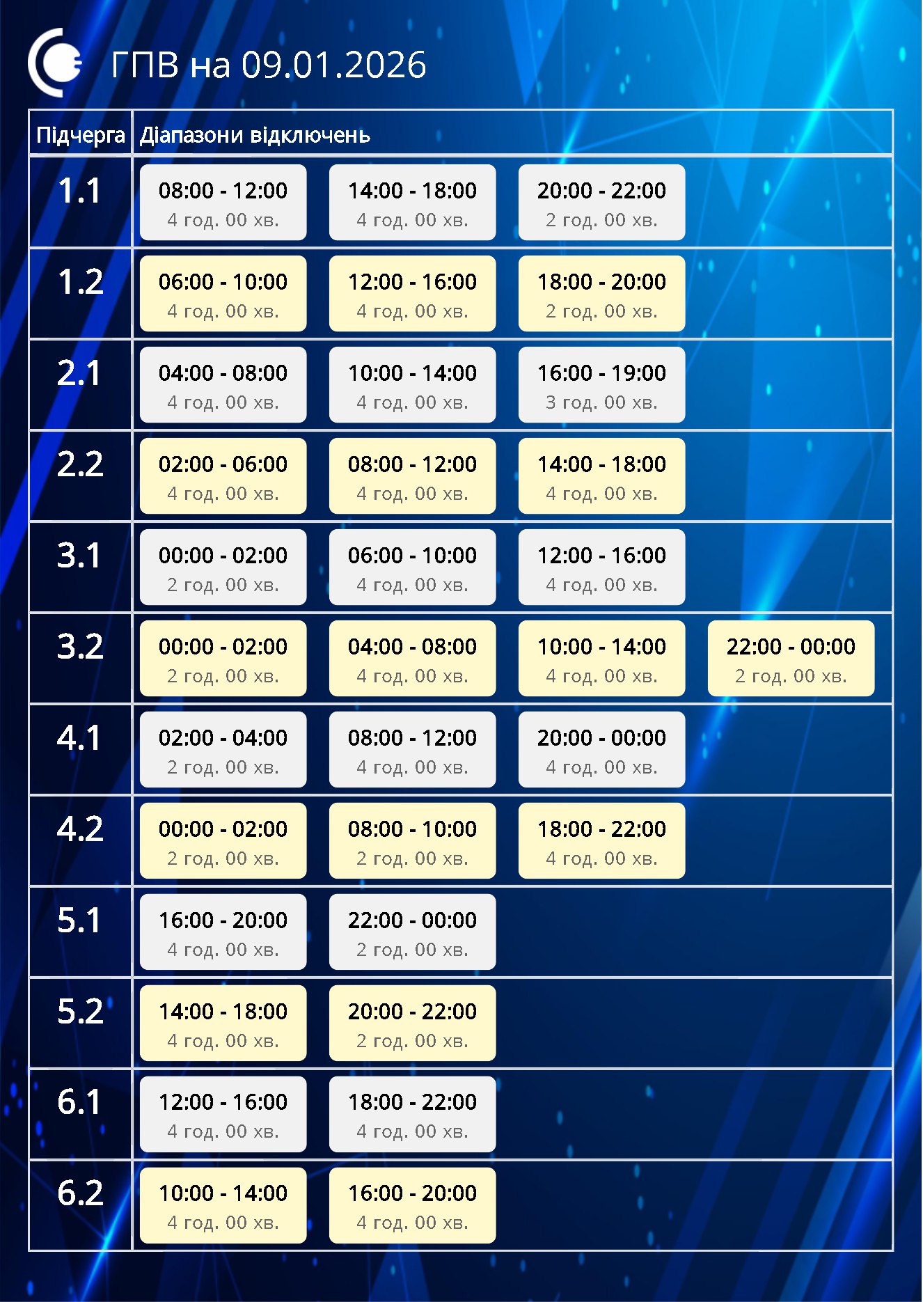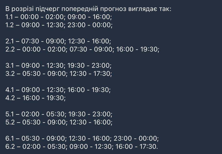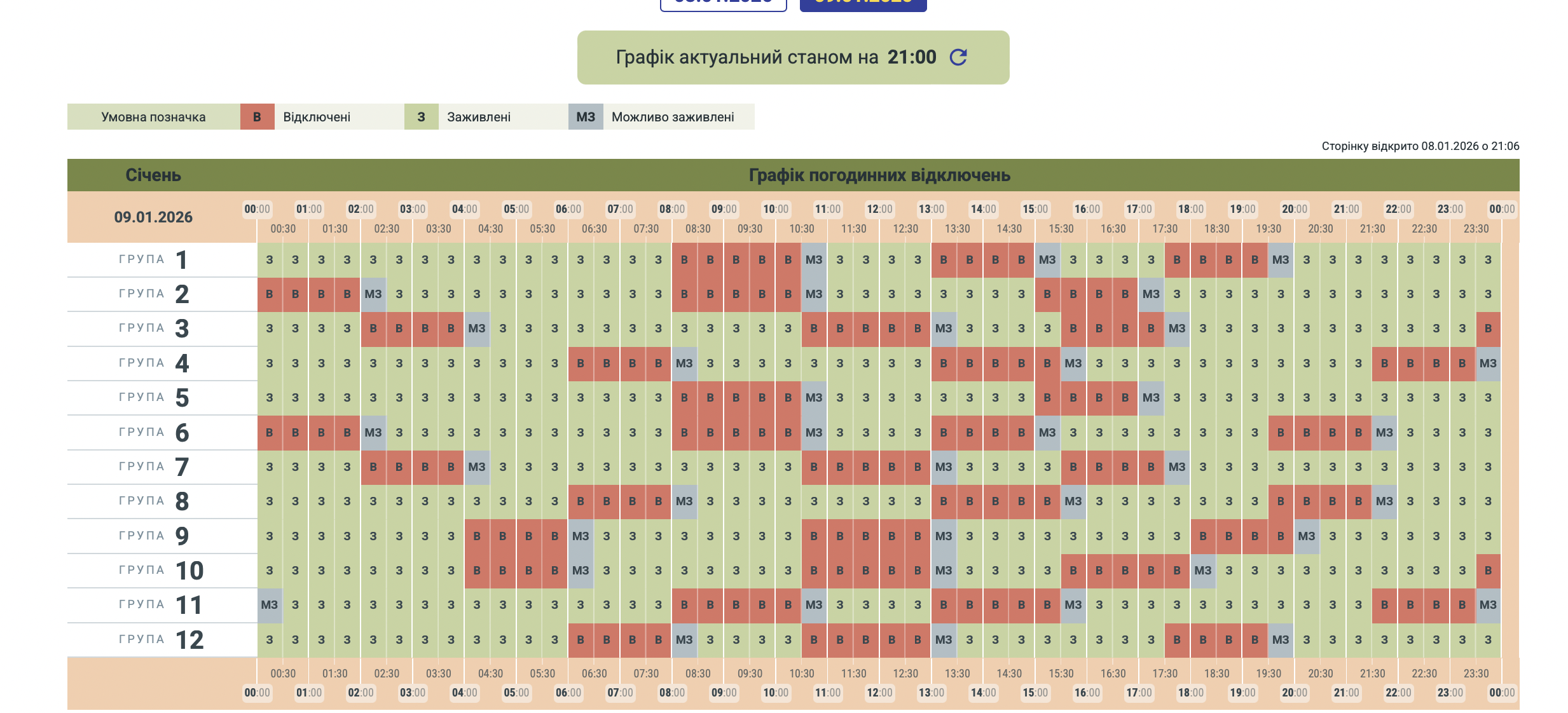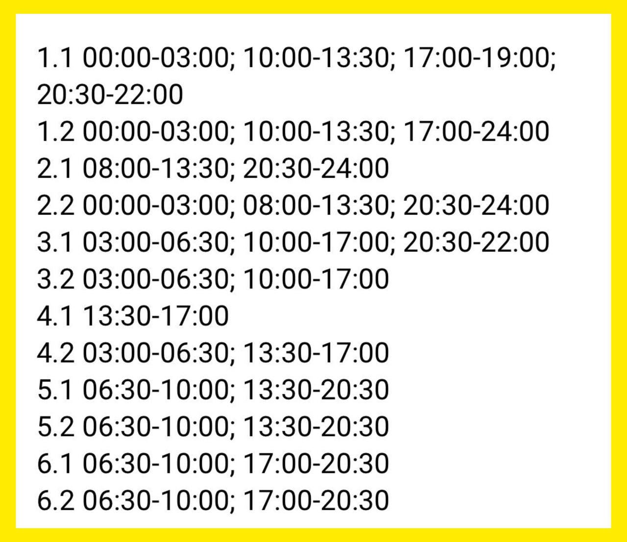 В течение суток время и объем отключений могут изменяться в зависимости от ситуации в энергосистеме. Чтобы быть в курсе, проверяйте актуальные графики на сайте или официальных страницах вашего облэнерго. Отметим, что графики на оккупированных территориях не действуют, также от графиков не зависит отключение света в Луганской области и в других зонах боевых действий.