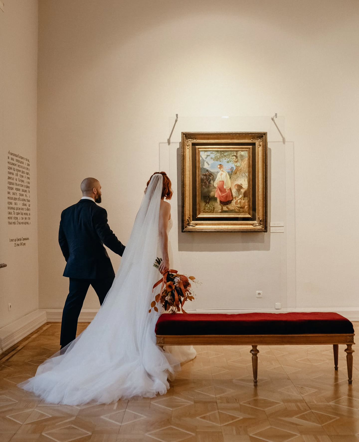 Военнослужащий показал фотографию со свадьбы рядом с возлюбленной. На снимке они оба позируют со спины. Маркус был в классическом черном костюме, а его жена — в белом платье с длинным шлейфом и фатой.