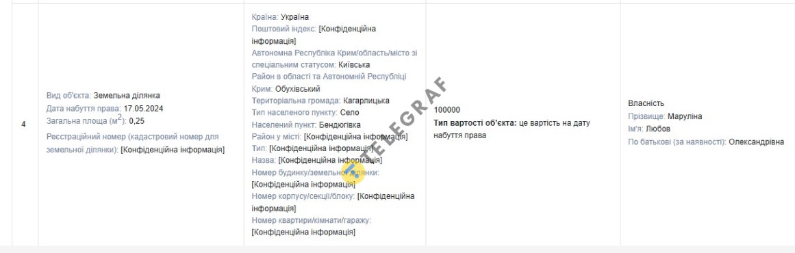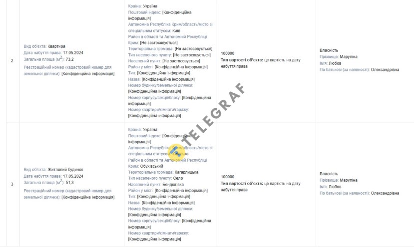 17 мая 2024 года Любовь Марулина приобрела сразу три объекта недвижимости. Все три она оценила по 100 тысяч гривен каждый, что выглядит подозрительно заниженной стоимостью. Первым объектом стала квартира площадью 73,2 квадратных метра в Киеве. По рыночным ценам такая жилая площадь в столице стоит минимум несколько миллионов гривен.