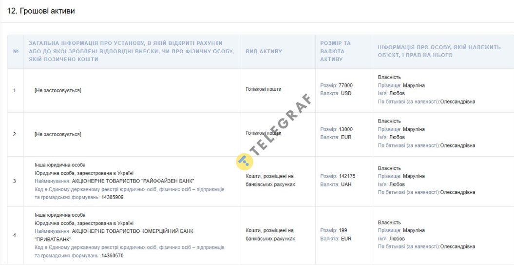 Два миллиона зарплаты, пенсия и огромные валютные запасы: что задекларировала Марулина за прошлый год