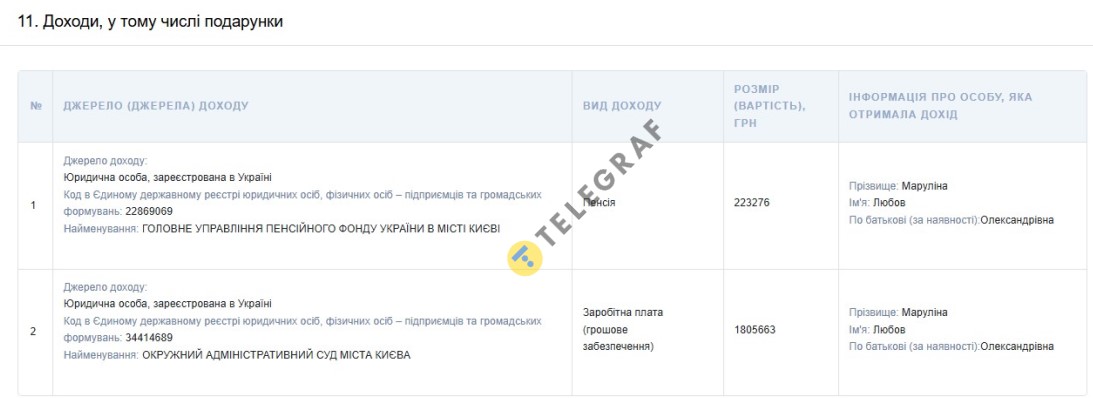 За 2024 Любовь Марулина получила 1 миллион 805 тысяч гривен зарплаты из Окружного административного суда Киева. Кроме этого, она получает пенсию в размере 223 тысяч гривен в год. Общий официальный доход судьи составил более 2 миллионов гривен.
