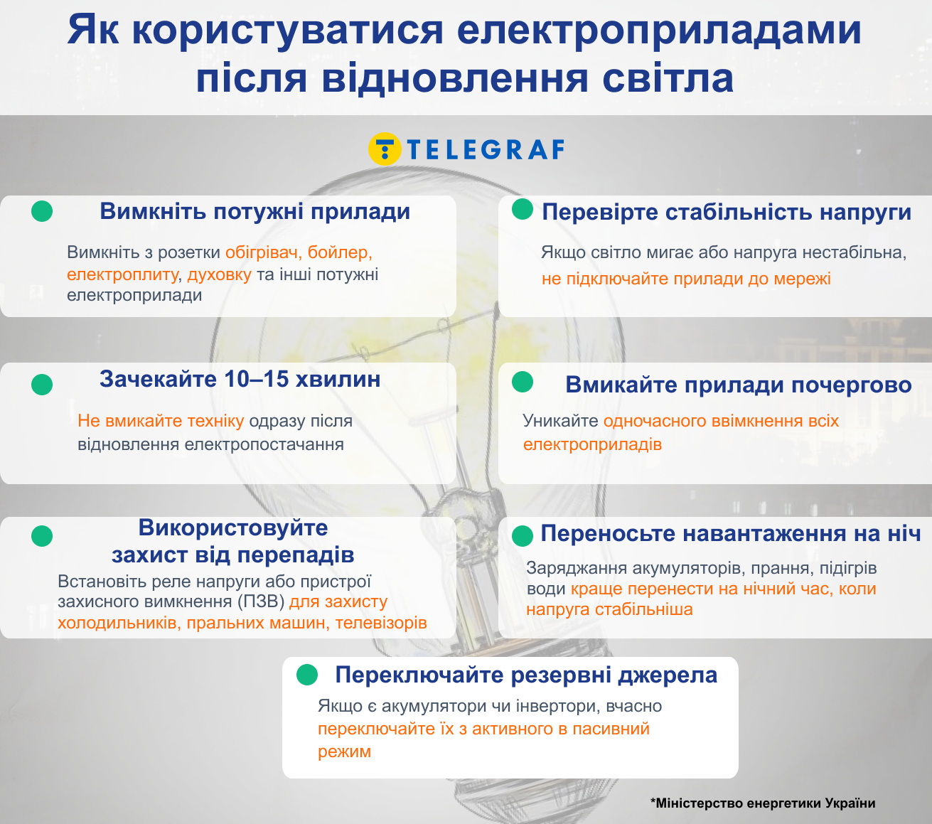 Когда свет исчезает, обязательно выключите все мощные приборы – бойлер, обогреватель, стиральную машину, электроплиту. После возобновления электроснабжения ждите 10–15 минут, прежде чем снова подключать технику. За это время напряжение в сети стабилизируется.
