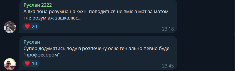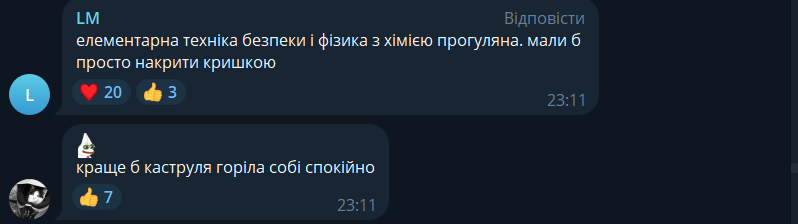 В комментариях под опубликованными видео момента пожара украинцы сразу же поинтересовались, чем пытались потушить кастрюлю — может соляркой, или бензином? Другие обвинили девушек в элементарном незнании физики и кулинарии — достаточно было накрыть кастрюлю крышкой, чтобы она затухла. А лить в горящее масло воду — верный и гарантированный способ устроить масштабный пожар.