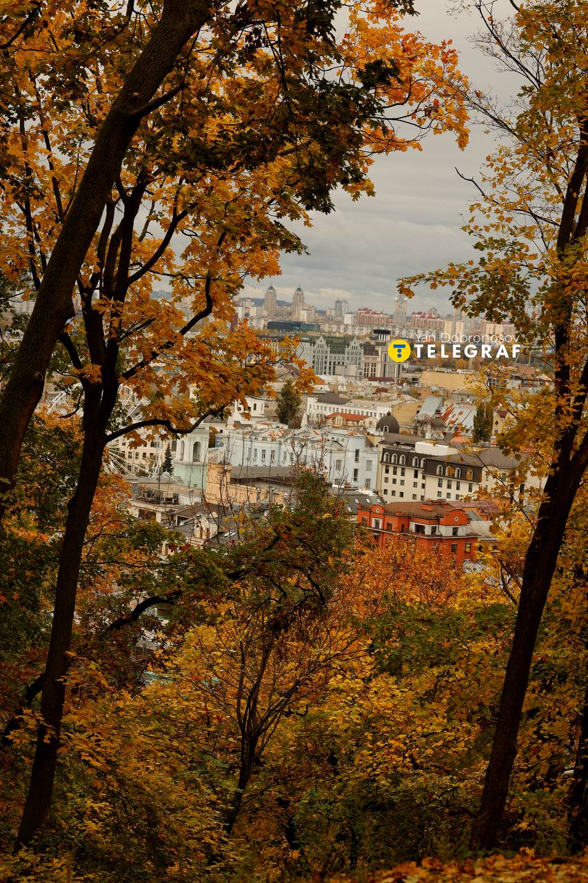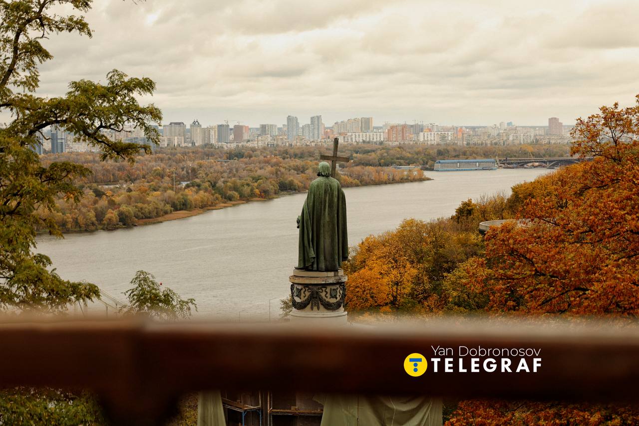 Одной из самых красочных локаций в столице в октябре считается Владимирская горка. На ней открывается непревзойденная панорама столицы и памятника Владимиру Великому. Более того, вокруг все деревья так и кричат разноцветьем: от ярко зеленого до оранжевого.