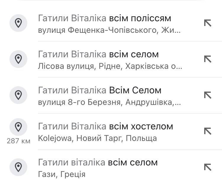 Так, метка "Гатили Віталіка всім селом/поліссям" (т.е. "Били Виталика всем селом") есть в Житомире на улице Фещенка-Чопинского, в Харьковской области в селе Родное на улице Лесной, на улице 8-го Марта города Андрушевка Житомирской области.