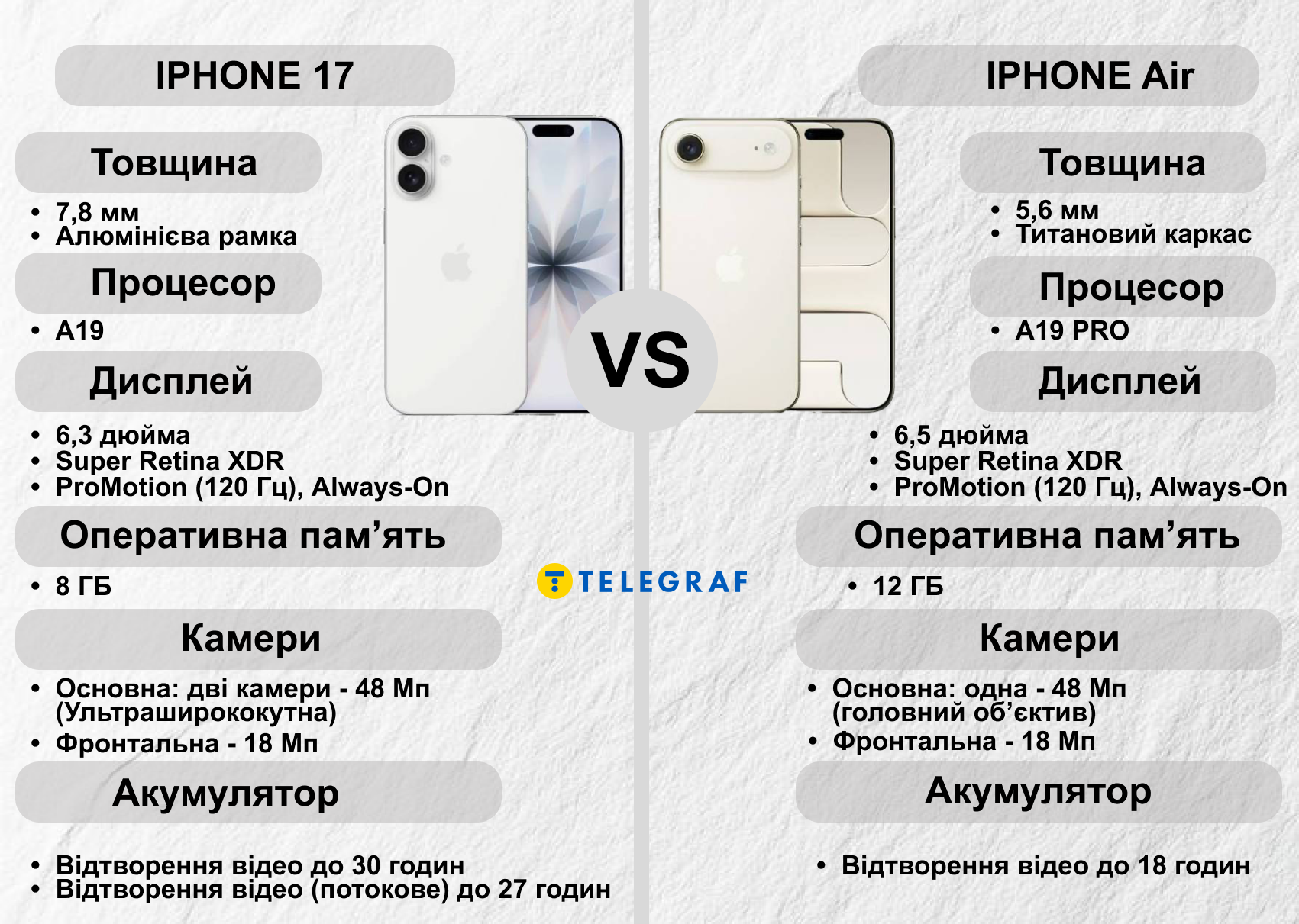"Телеграф" решил сравнить характеристики iPhone 17 и iPhone Air и рассказал, чем именно эти телефоны отличаются друг от друга помимо внешнего вида.