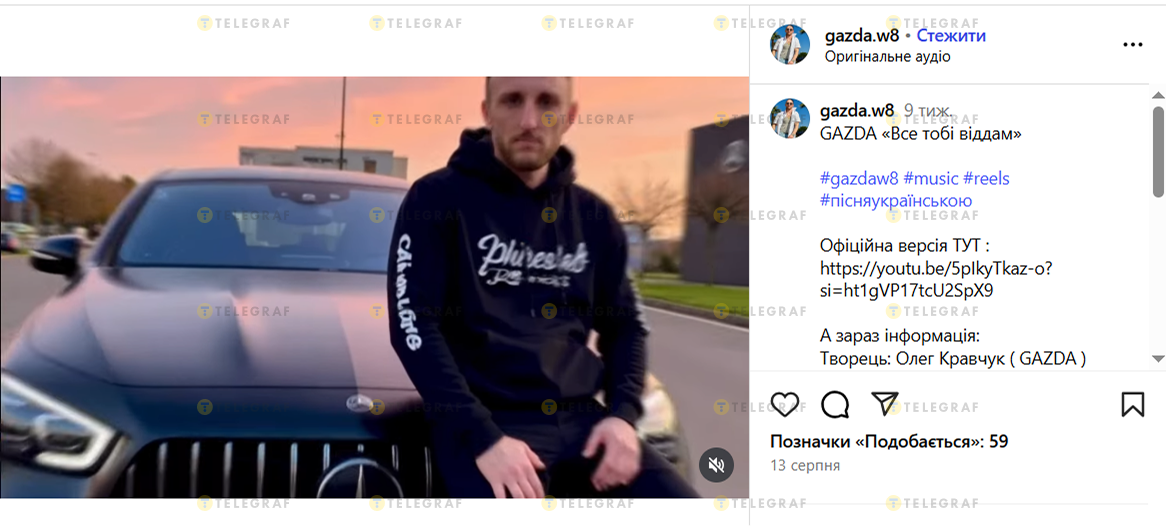 Телеграф из собственных источников узнал детали этой истории. За рулем авто, предварительно, был Олег Кравчук, также известный как GAZDA. В сети он называет себя мотиватором молодых организмов, PUBG influencer’ом (блогер или геймер, создающий контент, связанный с игрой PUBG (PlayerUnknown’s Battlegrounds) и просто богатым дядей.