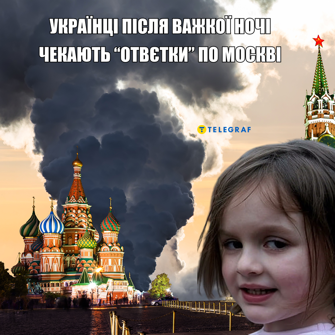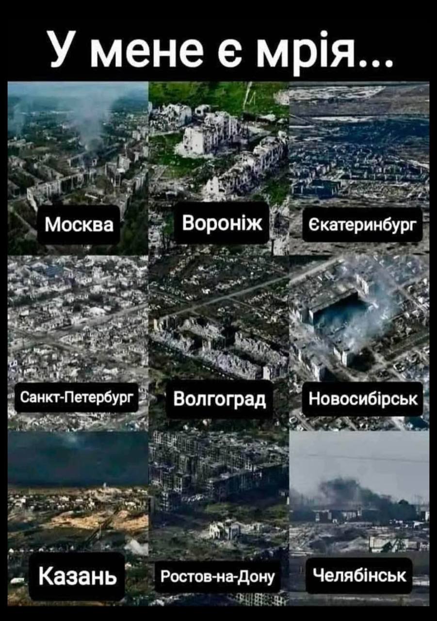 "Телеграф" собрал мемы и шутки, которые публикуют в сети после ночной атаки. Один из них очень красноречивый. Это коллаж из картинок, на которых российские города стоят в развалинах и дымятся после воздушных ударов. Подписан коллаж "У меня есть мечта". Россия пытается уничтожить украинские города и села, а украинцы желают им пережить то, что они устраивают на нашей земле.