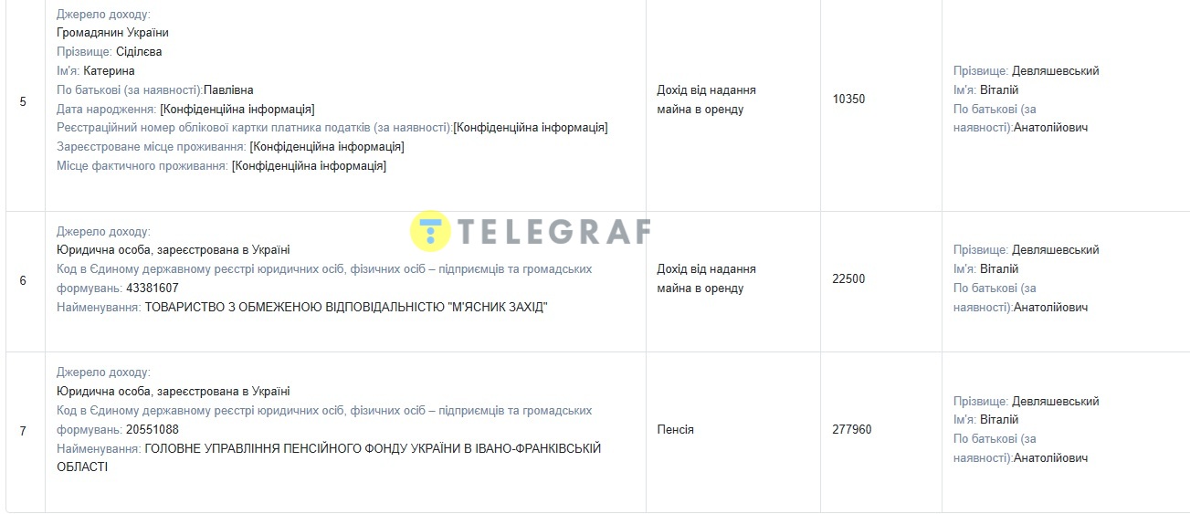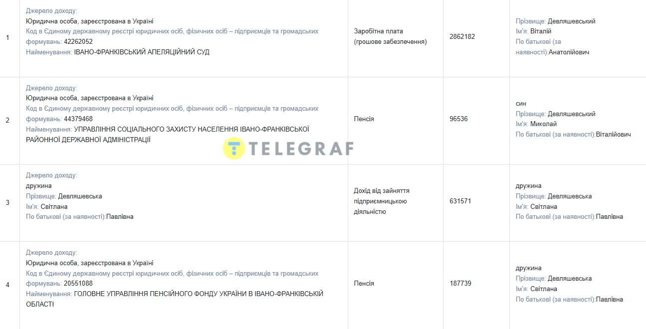 Согласно данным годовой декларации Девляшевского, за 2024 год он в суде заработал почти три миллиона гривен (2 862 182 грн.). А помимо этого получил еще 277 тысяч пенсии и 30 тысяч гривен от сдачи имущества в аренду.