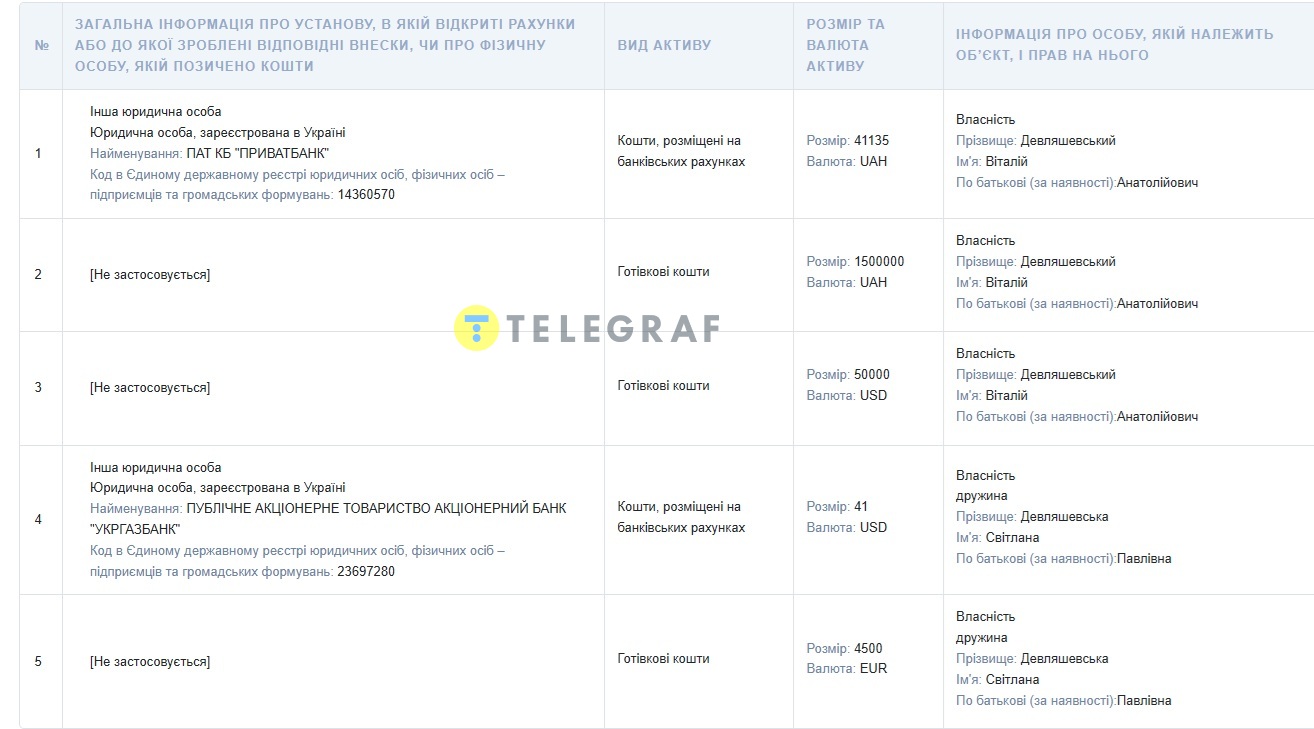 А в закромах у Девляшевского имеется полтора миллиона гривен и 50 тысяч долларов (около 2 миллионов гривен). Его жена накопила 4500 долларов (180 тысяч гривен).