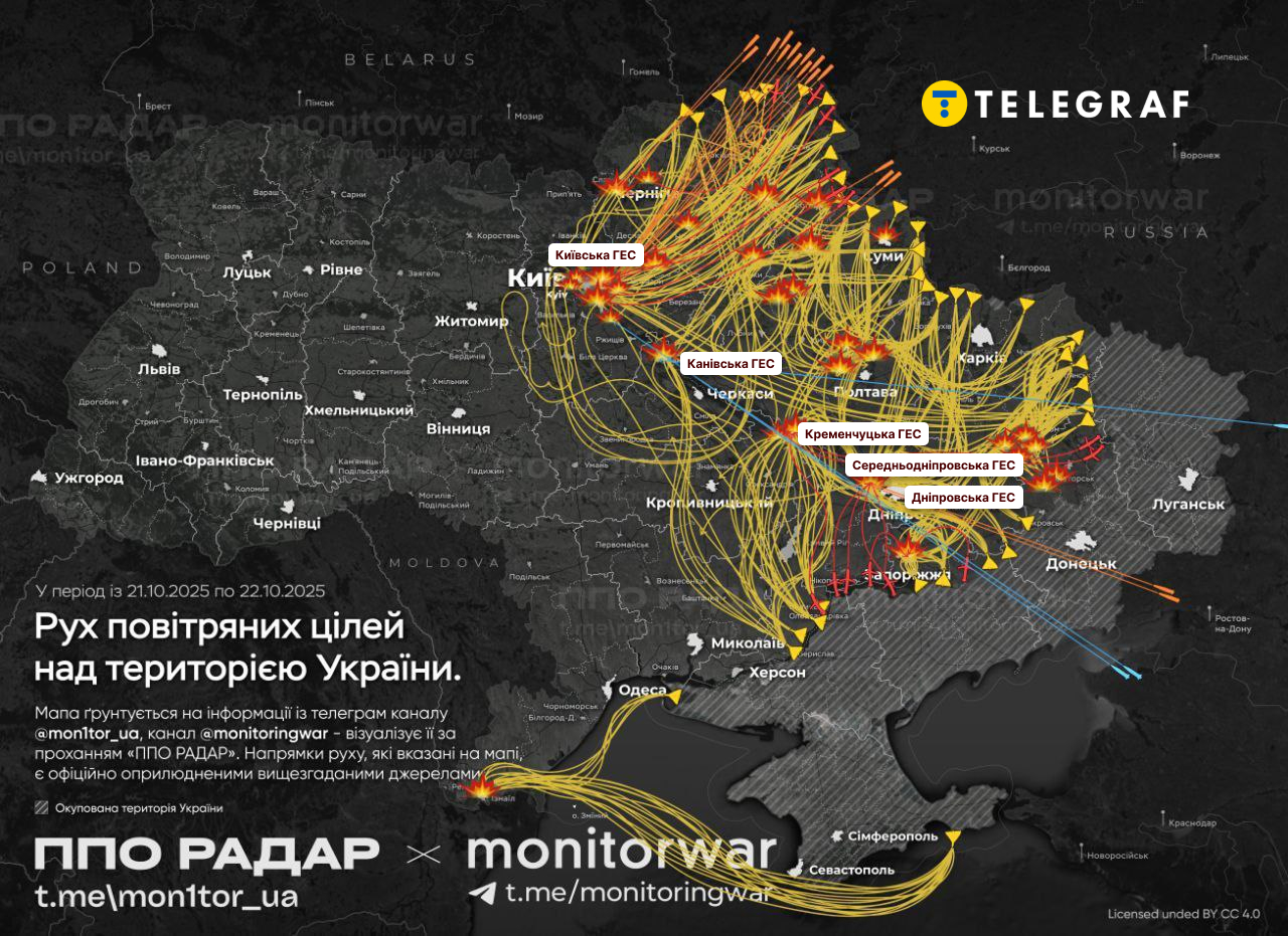 Ночью с 21 на 22 октября российские войска нанесли массированный удар дронами и баллистическими ракетами по энергетической инфраструктуре. Главной особенностью этой атаки стало то, что почти все прилеты были зафиксированы на левом берегу Днепра, а основной целью стали объекты энергогенерации.