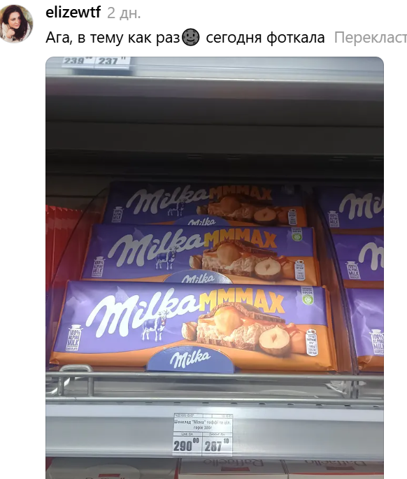 Еще одним продуктом, цены на который поражают украинцев, это шоколад. Пользователи делятся фотографиями сладости из супермаркета. Вес этой шоколадки — 300 граммов.