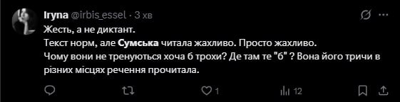 Украинцы также пишут, что Наталья Сумская читала текст ужасно и считают, что она не тренировалась перед прямым эфиром. Не обошлось и без комментариев, что диктовать его должен был учитель.